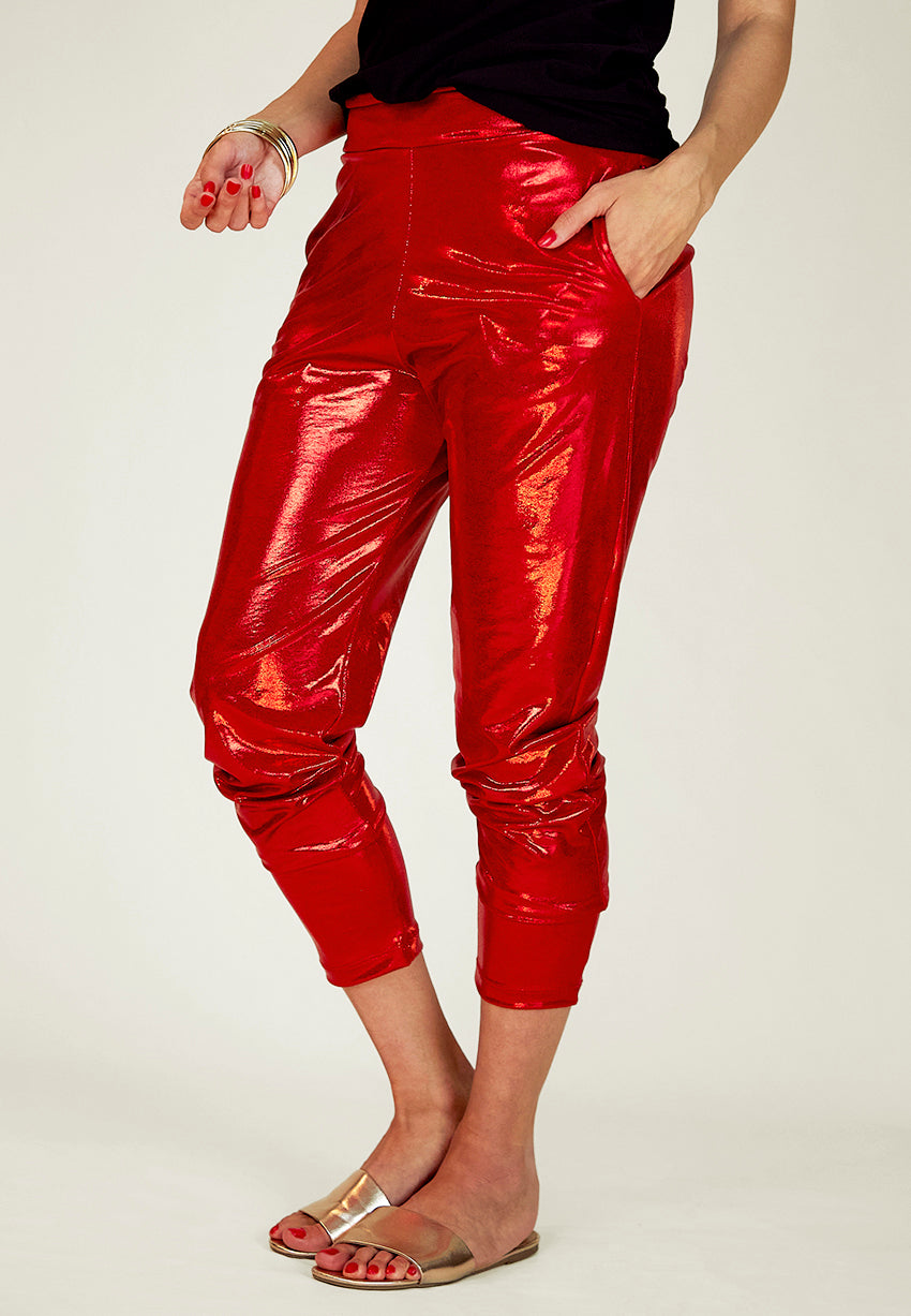 "I am starting to see big brands making metallic pants but yours are much better! Got mine in Ruby Red size Large and I love them! I can't wait to wear them!"