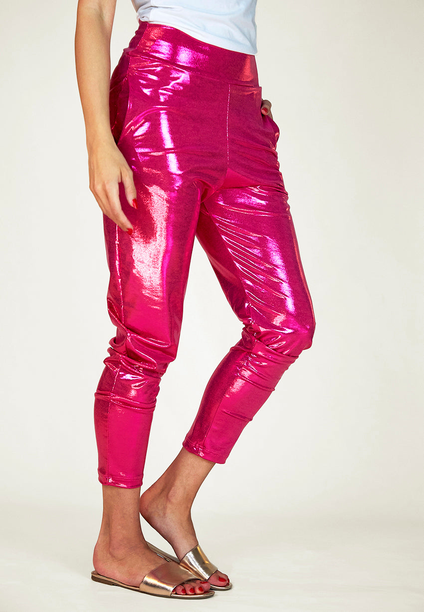 Glamorous, versatile, casual, and effortlessly chic, our metallic slouched pants are designed to elevate your look with ease. Sitting comfortably at the mid-waist, you have the freedom to style them higher or lower according to your mood. Roomy from the waist through the thighs and elegantly trimmed at the bottom, they embody a loose-fit, low-crotch, cool-babe boyfriend style – complete with pockets for added functionality.