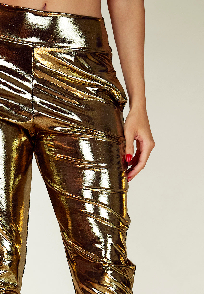 Prepare to be captivated by the mesmerizing wet look of these Liquid Gold pants. With a deep, darker shade that exudes opulence, everything takes on a richer, more luxurious vibe. Paired with black, they create an enigmatic appearance that commands attention wherever you go. Whether you prefer a sleek, long silhouette or embrace your rebellious side with a shorter length, wear them the way you feel today and let your confidence shine.
