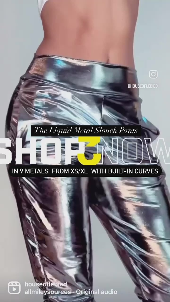 Glamorous, versatile, casual, and effortlessly chic – our metallic slouched pants are designed to enhance your wardrobe with ease. Sitting comfortably at the mid-waist, you have the freedom to style them higher or lower according to your mood. Roomy from the waist through the thighs and elegantly trimmed at the bottom, they embody a loose-fit, low-crotch, cool-babe boyfriend style – complete with pockets for added functionality.