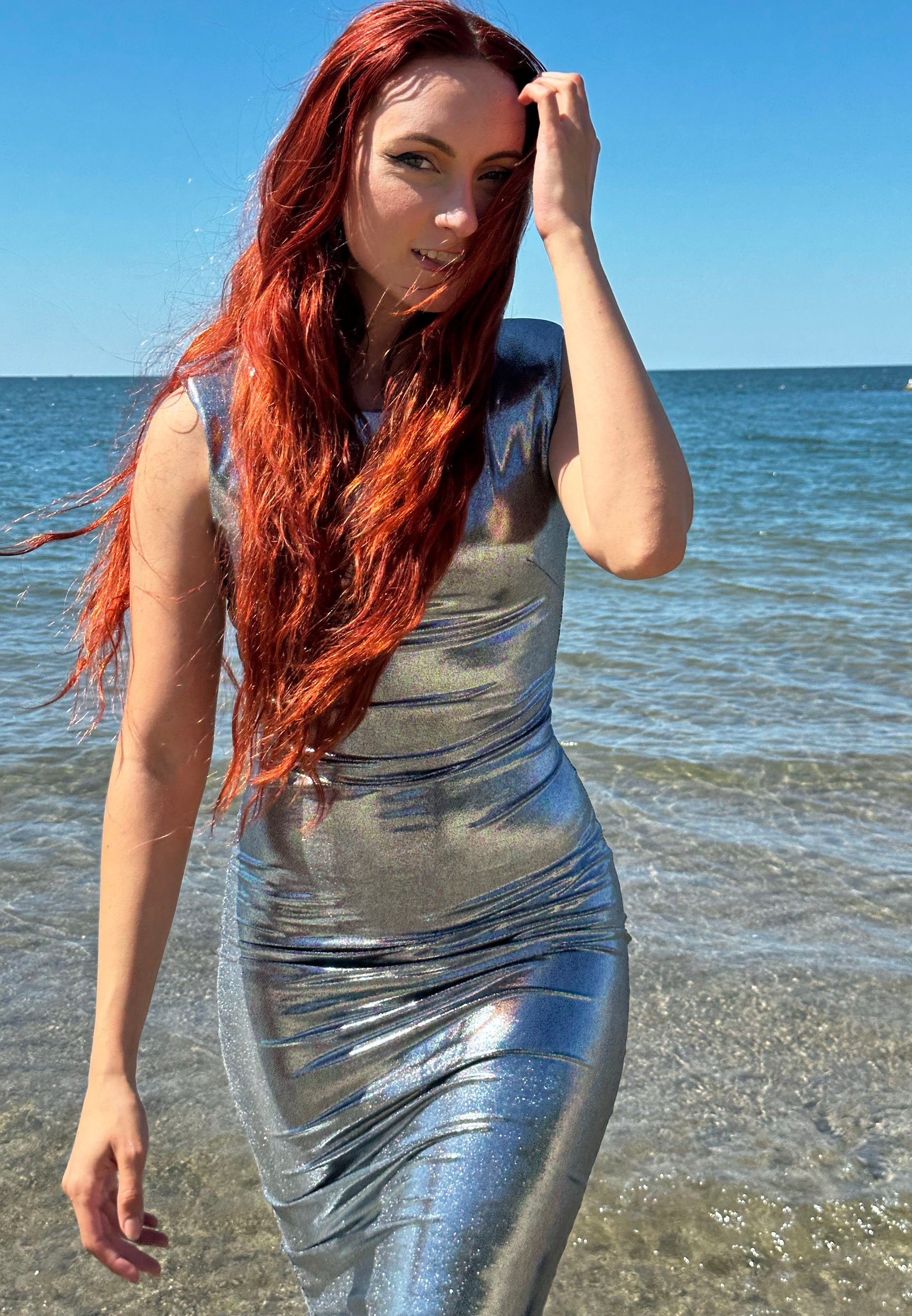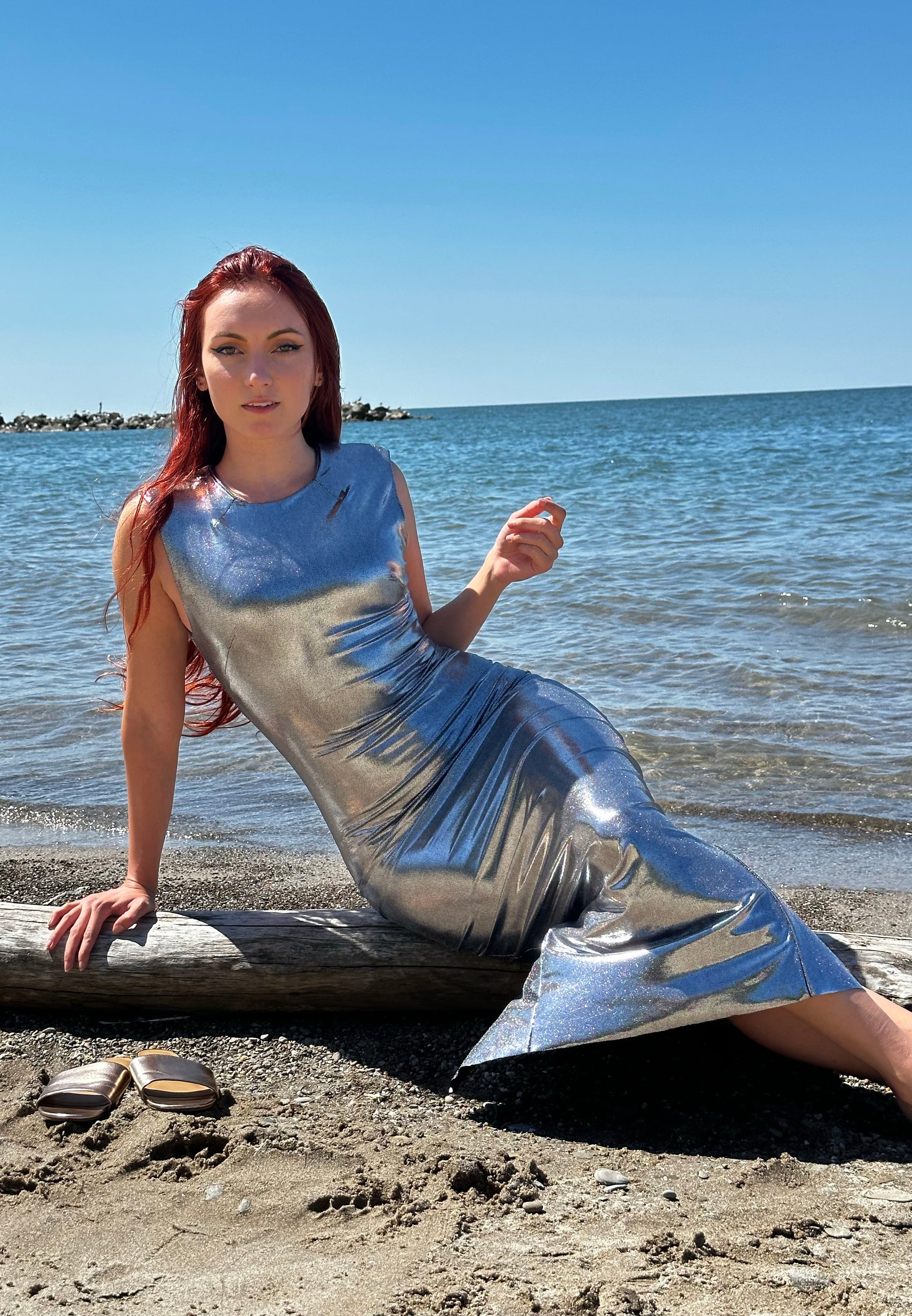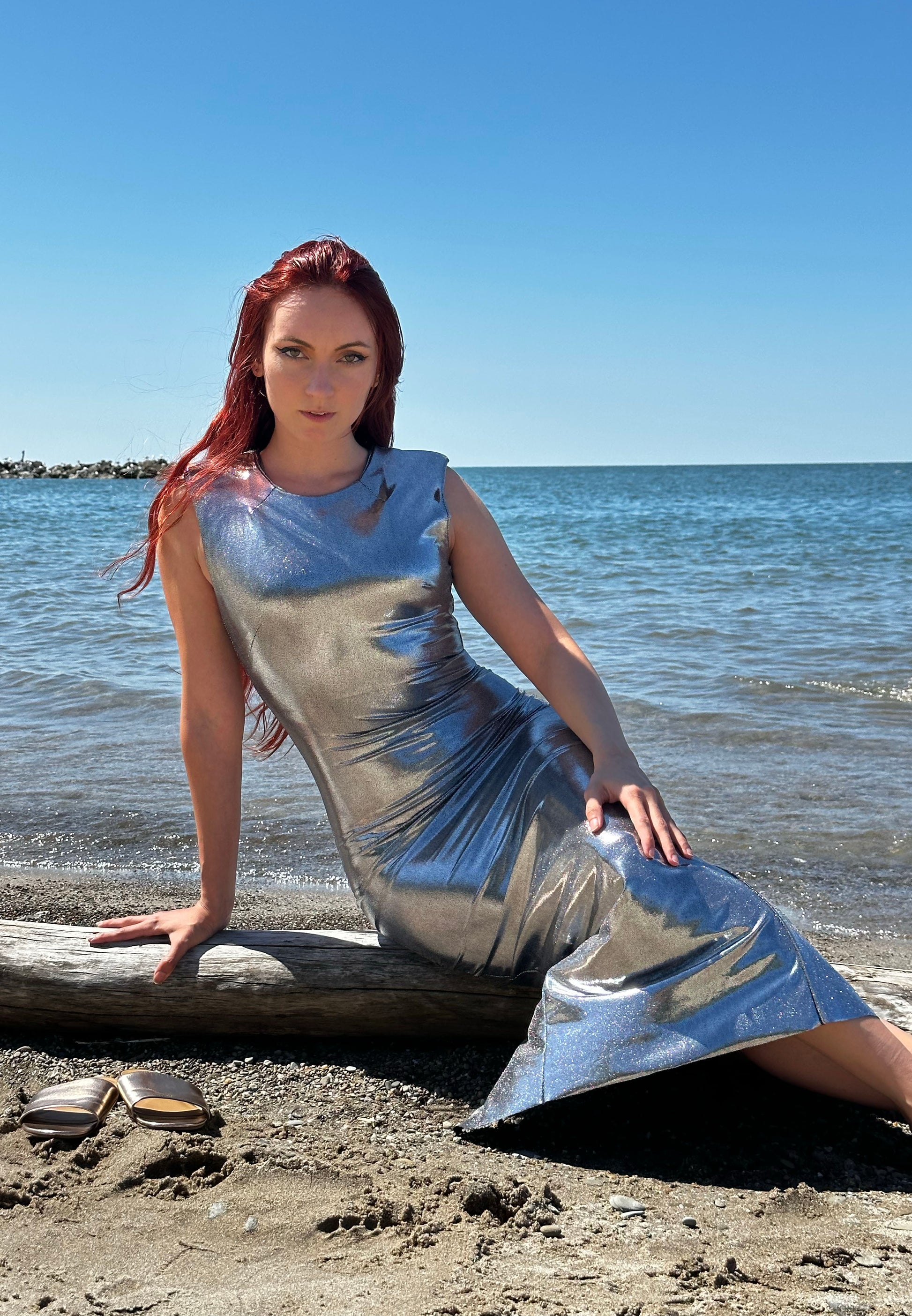 Drawing inspiration from Hollywood's glam, the minimalist futurism of the 60s plus the tech of Now, The Lebied Liquid Pewter Long Sleeveless Sculpt Dress is here to make you Glow. Feel free to love the skin you are in. Shine.
