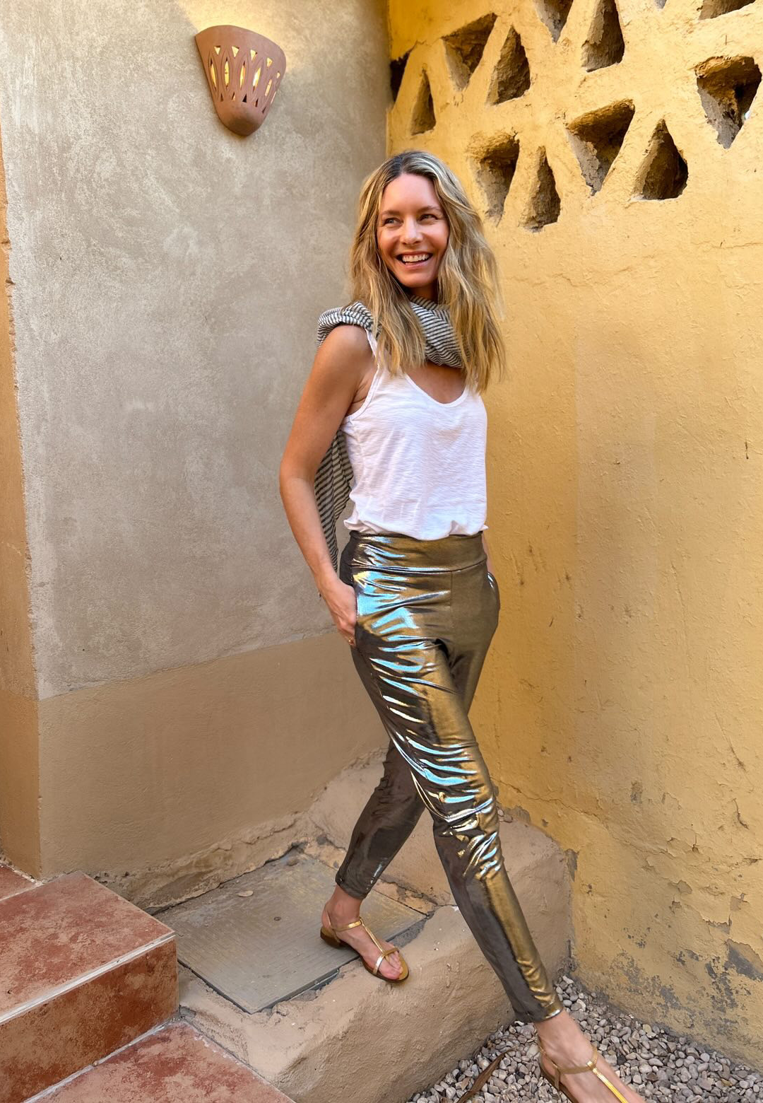 "I absolutely love these shimmery gold pants! They are the perfect blend of comfort and sophistication. So comfortable, soft and stretchy, I could wear them all day long."