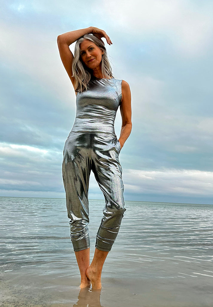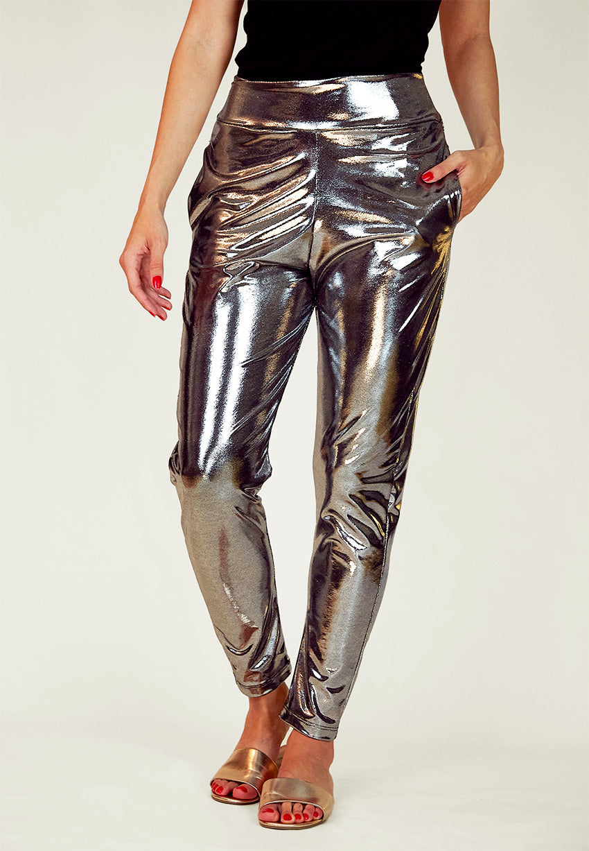 Glamorous, versatile, casual, and chic – our metallic slouched pants are designed to enhance your wardrobe with ease. Sitting comfortably at the mid-waist, you have the freedom to style them higher or lower according to your preference. Roomy from the waist through the thighs and elegantly trimmed at the bottom, they embody a loose-fit, low-crotch, cool babe boyfriend style – complete with pockets for added functionality.