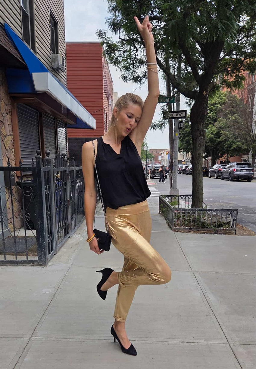 "I absolutely love these shimmery gold pants! They are the perfect blend of comfort and sophistication. So comfortable, soft and stretchy, I could wear them all day long."
