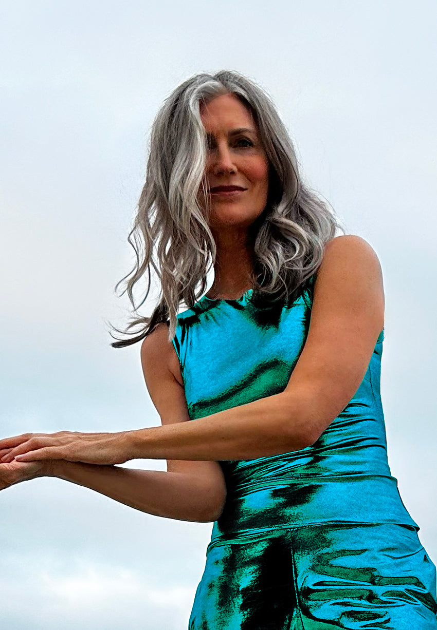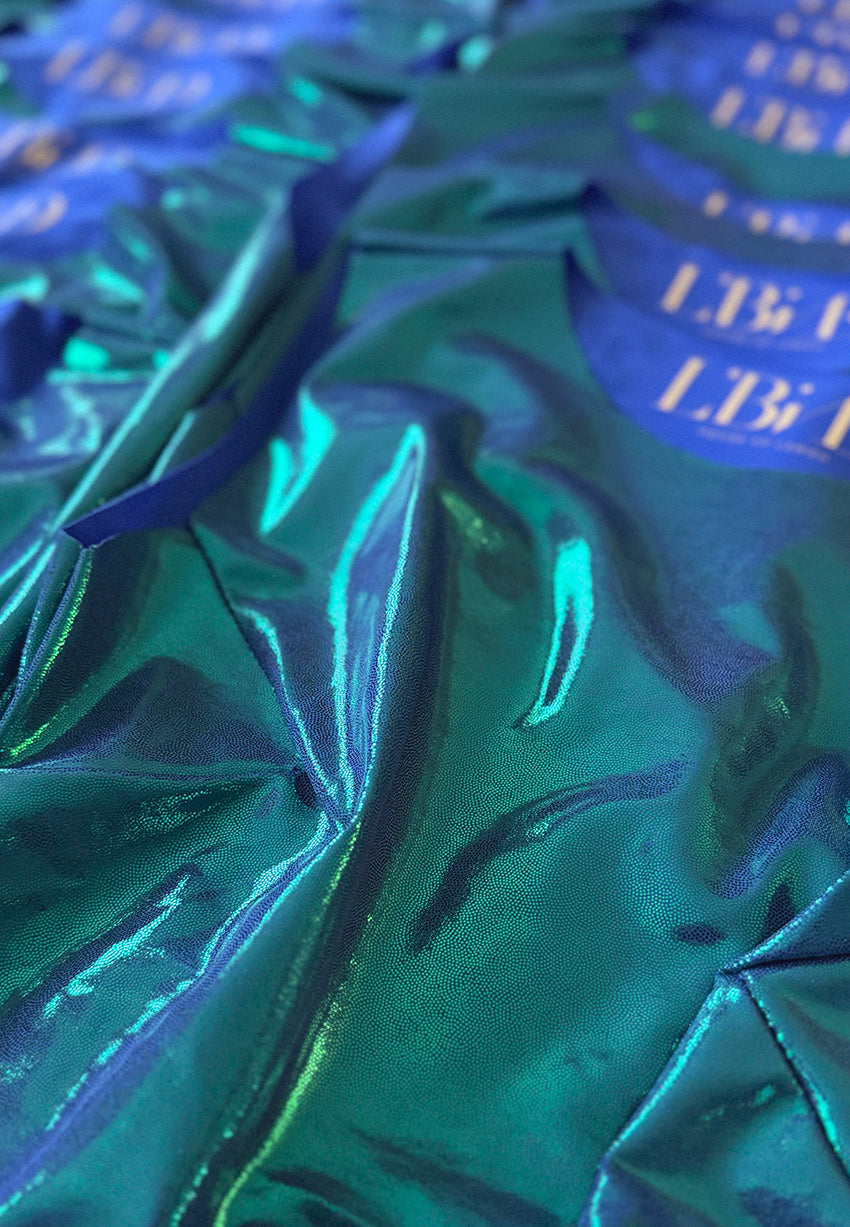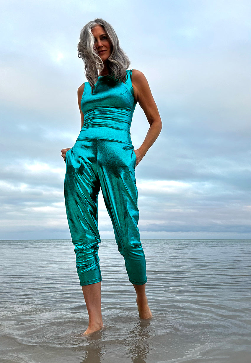 The Liquid Metal Long Tank Top in iridescent Paradise Blue – designed to flatter your figure and make you shine. Crafted to follow your body's natural shape while allowing for comfortable movement, it features a wide shoulder, high collar, and low waist-length design, offering great coverage, contouring and charm. Combine it with your Liquid Metal Slouch pants for a full head to toe experience. It's a great alternative to a dress for a freeing, relaxed and confident glam night out!