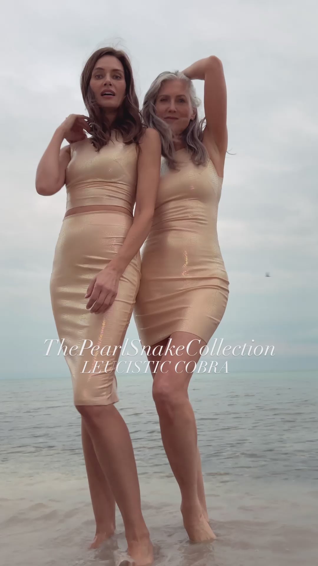 The Pearl Snake Tank Top in a chic Champagne Pearl – designed to flatter your figure effortlessly. Crafted to follow your body's natural shape while allowing for comfortable movement, it features a wide shoulder, high collar, and waist-length design, offering the perfect balance of coverage, contouring and zest.