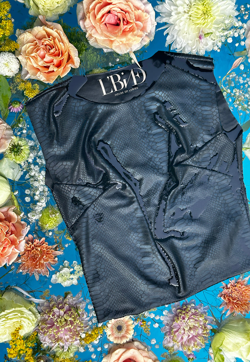 The Pearl Snake Tank Top in an enigmatic Black Mamba– designed to flatter your figure effortlessly. Crafted to follow your body's natural shape while allowing for comfortable movement, it features a wide shoulder, high collar, and waist-length design, offering the perfect balance of coverage, contouring and zest.
