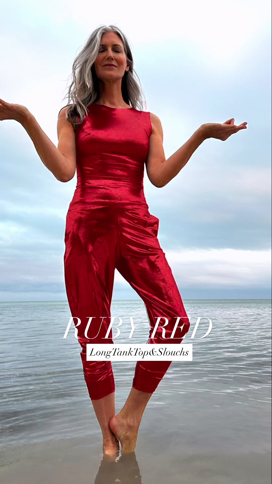 The Liquid Metal Long Tank Top in Ruby Red – designed to flatter your figure and make you shine. Crafted to follow your body's natural shape while allowing for comfortable movement, it features a wide shoulder, high collar, and low waist-length design, offering great coverage, contouring and charm. Combine it with your Liquid Metal Slouch pants for a full head to toe experience. It's a great alternative to a dress for a freeing, relaxed and confident glam night out!
