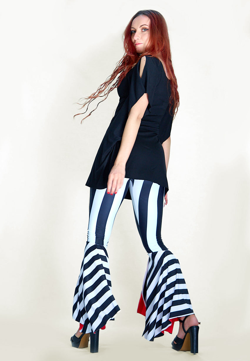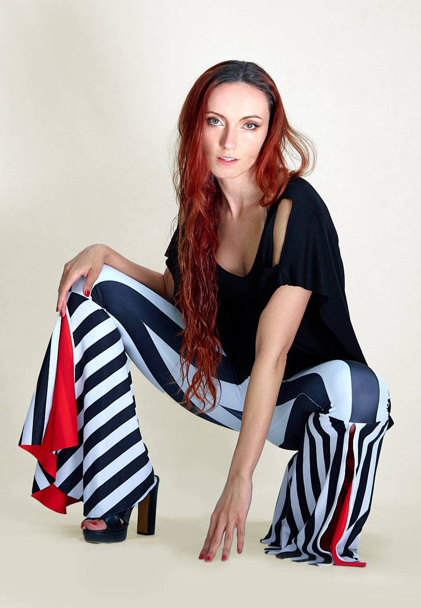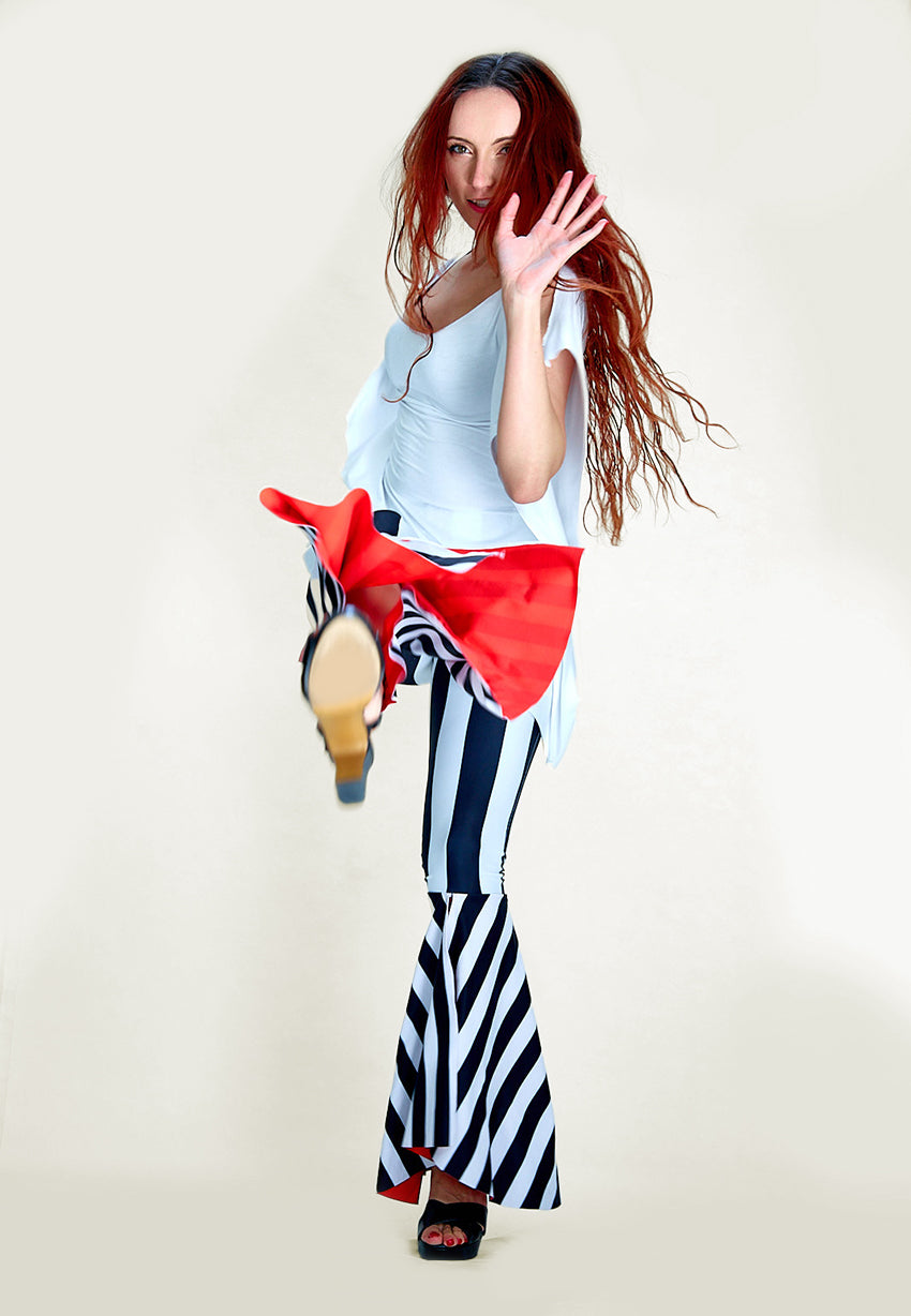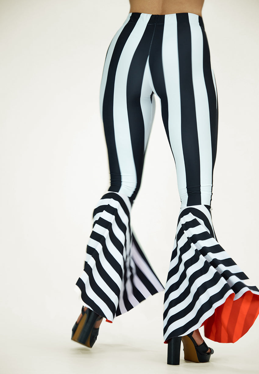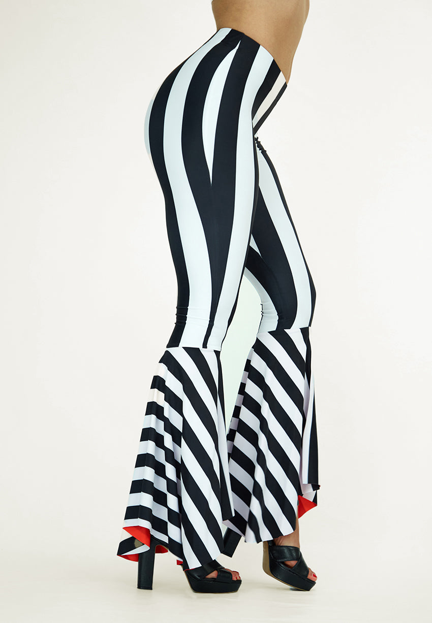 Rocking Cool. Our Striped Flare Pants made with the latest print technology. These pants feature a 4-way stretch double-sided custom print with UPF 50 protection and chlorine resistance. Ready to withstand any concert, beach-pool party, or night out.