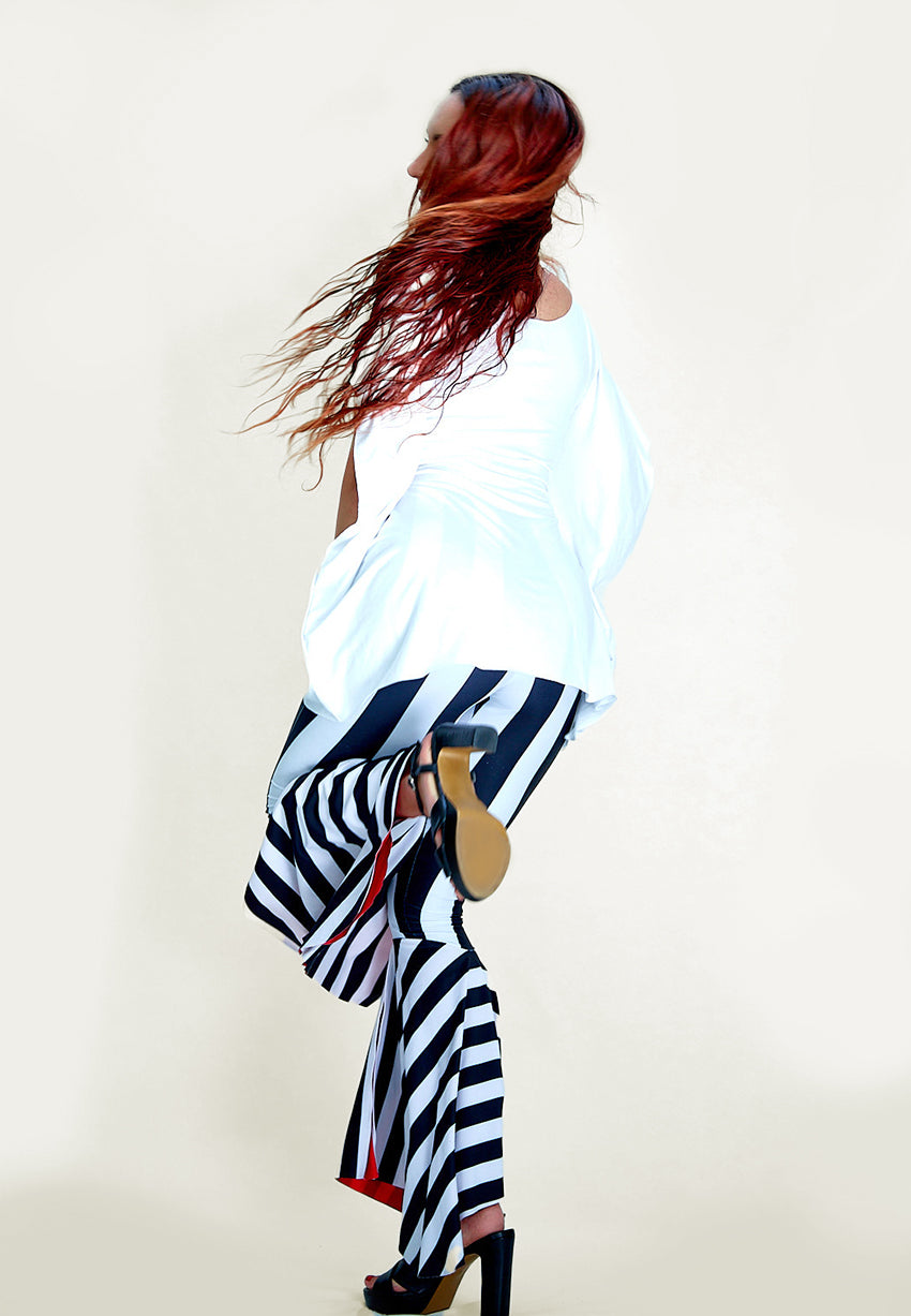As you move, the bottom flare starting below the knee gracefully opens up, revealing a vibrant fire RED lining on the reverse side. Pair them with a black, red, yellow, or white top – whether cropped, long, or even a shirt. For added allure, layer them with a long coat to reveal just enough and intrigue everyone who sees you pass by.