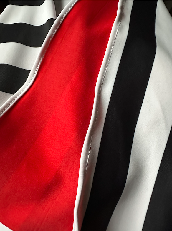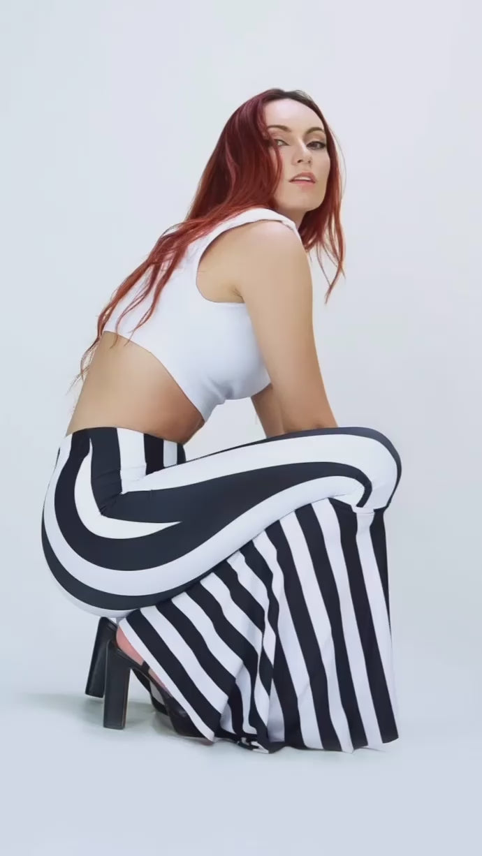 The vertical lines in classic black and white are strategically designed to elongate the figure while accommodating curves without distorting the stripes. This smart design detail creates a slender and curvy silhouette that's bound to turn heads. Comfortably secured at the waist, you can dance all night without even feeling them.